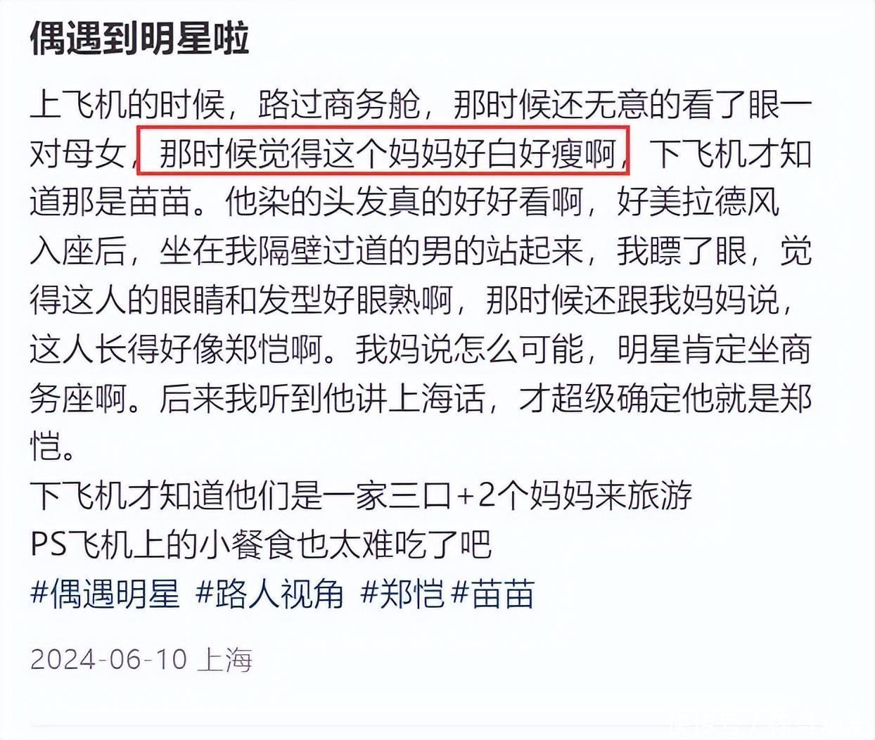 网友共享了偶遇的始末,知道苗苗母女是坐在商务舱,我方上飞机的时代途做交易务车时看到了,还感触这位姆妈好白好瘦,下了飞机才知谈那是苗苗。偶遇者夸赞苗苗染的头发很漂亮,是好意思拉德立场。